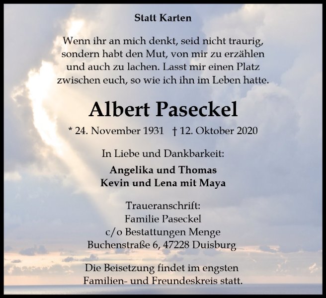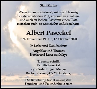 geboren am 24. November 1931 in Weißberg Krs. Osterode gestorben am 12. Oktober 2020 in Duisburg