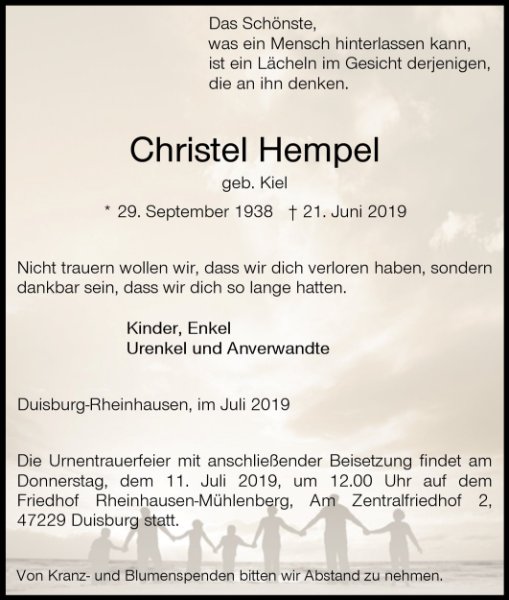 Liebe Christel,Ich vermisse dich, aber bin auch glücklich darüber, so viele Jahre mit dir und deiner Familie befreundet gewesen zu sein. In liebevollem Gedenken Conny