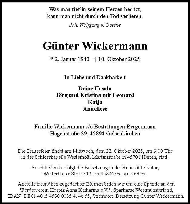 wir wünschen Ihnen für die kommende Zeit viel Kraft und dass es Ihnen gelingt, dankbar auf die positiven Erinnerungen zurückzublicken. Diese Gedenkseite möge Ihnen dabei helfen, Ihre Trauer zu teilen und das Andenken gemeinsam wachzuhalten.