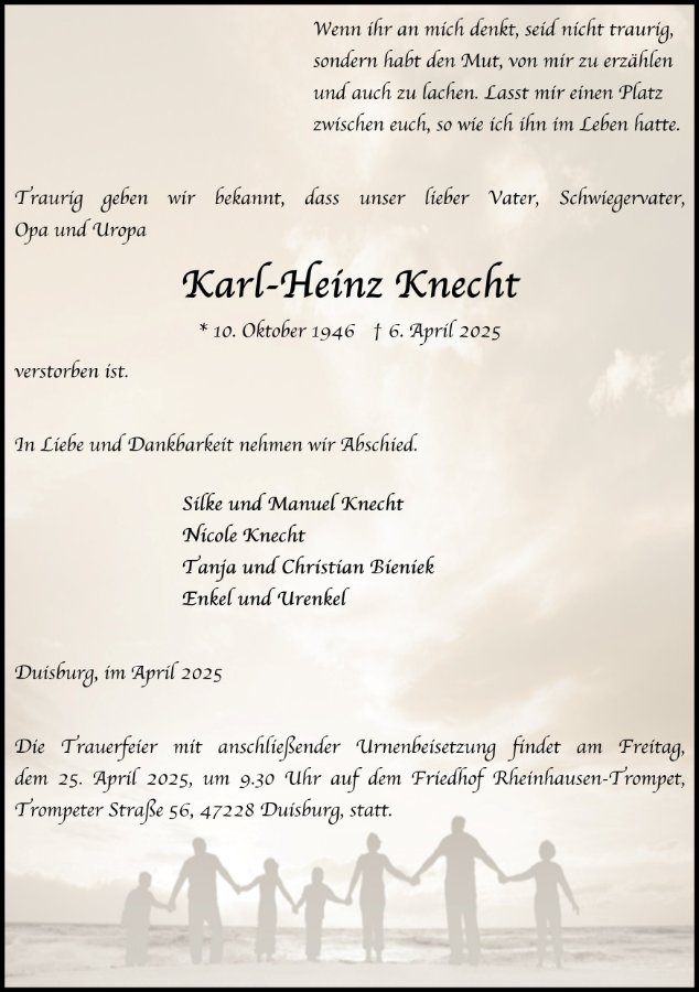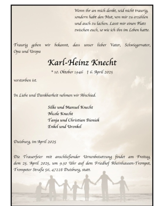 Hey Kalle , Als Gott sah , dass der Weg zu lang , der Hügel zu Steil , das Atmen zu schwer wurde legte er seine Arme um dich und sprach , komm Heim ... Du wirst hier Schmerzhaft Vermisst , dennoch tut es gut zu Wissen das du da oben nicht alleine bist und dein letzter Wunsch in Erfüllung ging .