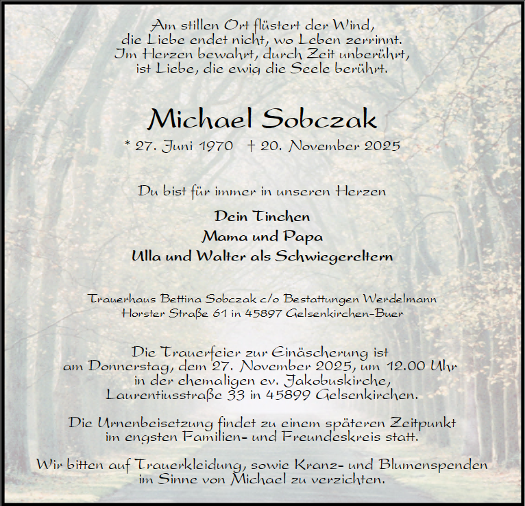 Liebe Bettina! Wir haben zwar sehr lange, leider, keinen Kontakt gehabt. Aber der Tod von Michael hat mich sehr traurig gemacht. Zum Glück habt ihr auch viele schöne Jahre, wie ich auf den Bildern gesehen habe, miteinander verbringen können. Es ist immer schwer sich von einem geliebten Menschen zu verabschieden. Die vielen schönen Momente werden werden dir Kraft und Stärke geben. Deine Tante Klara