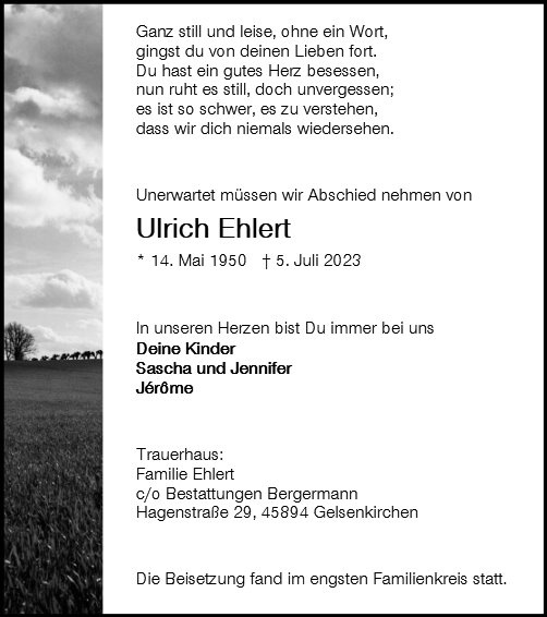 in dieser Zeit des Schmerzes wünschen wir Ihnen Kraft, den Verlust im Kreise Ihrer Liebsten zu verarbeiten. Als Zeichen unserer Anteilnahme und des Gedenkens entzünden wir dieses erste Licht. Möge diese Gedenkseite Ihnen helfen, Erinnerungen zu teilen und so das Andenken gemeinsam wachzuhalten.