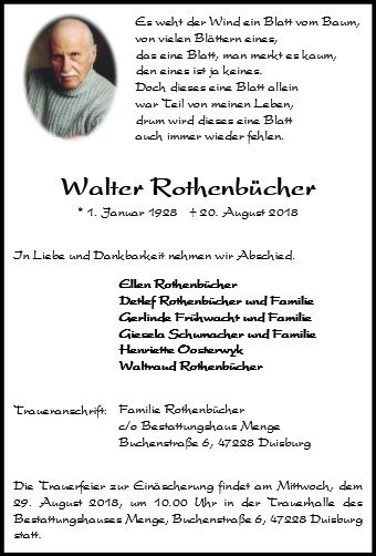 wir wünschen Ihnen für die kommende Zeit viel Kraft und dass es Ihnen gelingt, dankbar auf die positiven Erinnerungen zurückzublicken. Diese Gedenkseite möge Ihnen dabei helfen, Ihre Trauer zu teilen und das Andenken gemeinsam wachzuhalten.