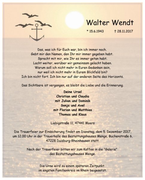 wir wünschen Ihnen für die kommende Zeit viel Kraft und dass es Ihnen gelingt, dankbar auf die positiven Erinnerungen zurückzublicken. Diese Gedenkseite möge Ihnen dabei helfen, Ihre Trauer zu teilen und das Andenken gemeinsam wachzuhalten.