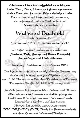in diesen Tagen fühlen wir mit Ihnen und wünschen Ihnen von Herzen, dass Sie aus den glücklichen Erinnerungen Kraft schöpfen, um positiv in die Zukunft zu gehen. Diese Gedenkseite möge Ihnen dabei helfen, Ihre Trauer zu teilen und das Andenken gemeinsam wachzuhalten.